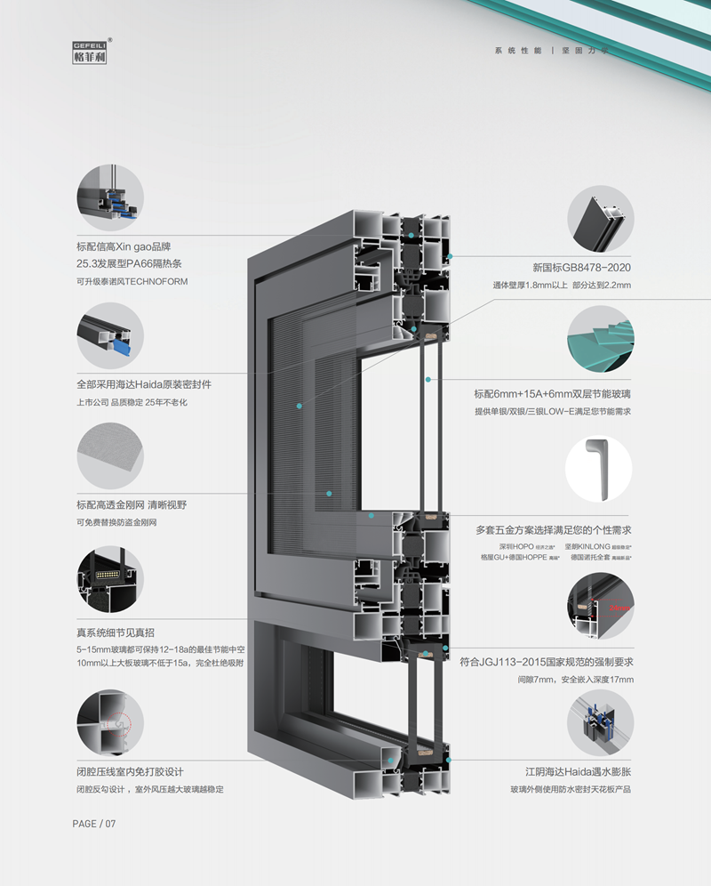 G112-190系列為格菲利公司王牌產(chǎn)品、其標(biāo)配的190型加強(qiáng)立柱,可以滿(mǎn)足窗戶(hù)高度6米的大尺寸要求。型材采用無(wú)限連接工藝,可以滿(mǎn)足任意的整框要求!